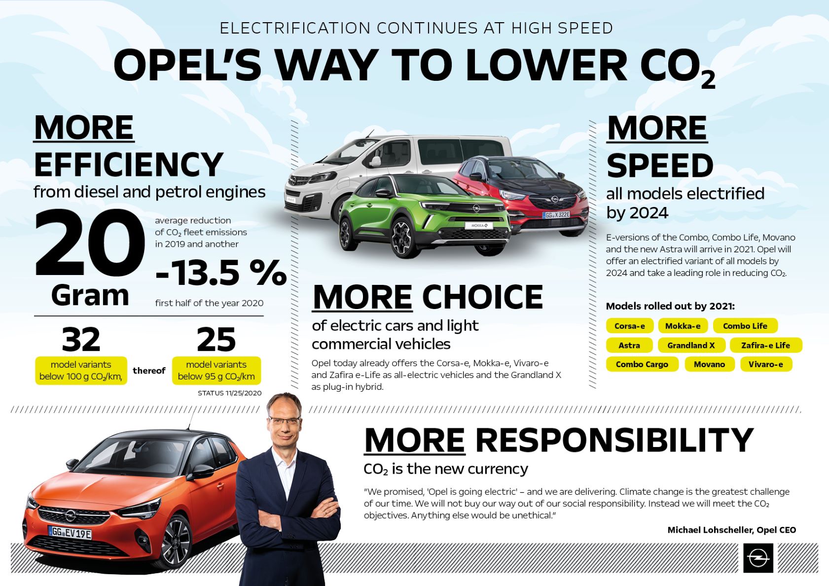 Em 2021, a marca alargará a sua gama de produtos com as versões “e” dos modelos Combo, Combo Life, Movano e do novo Astra. Até 2024, a marca do relâmpago terá versões eletrificadas de todos os seus modelos.