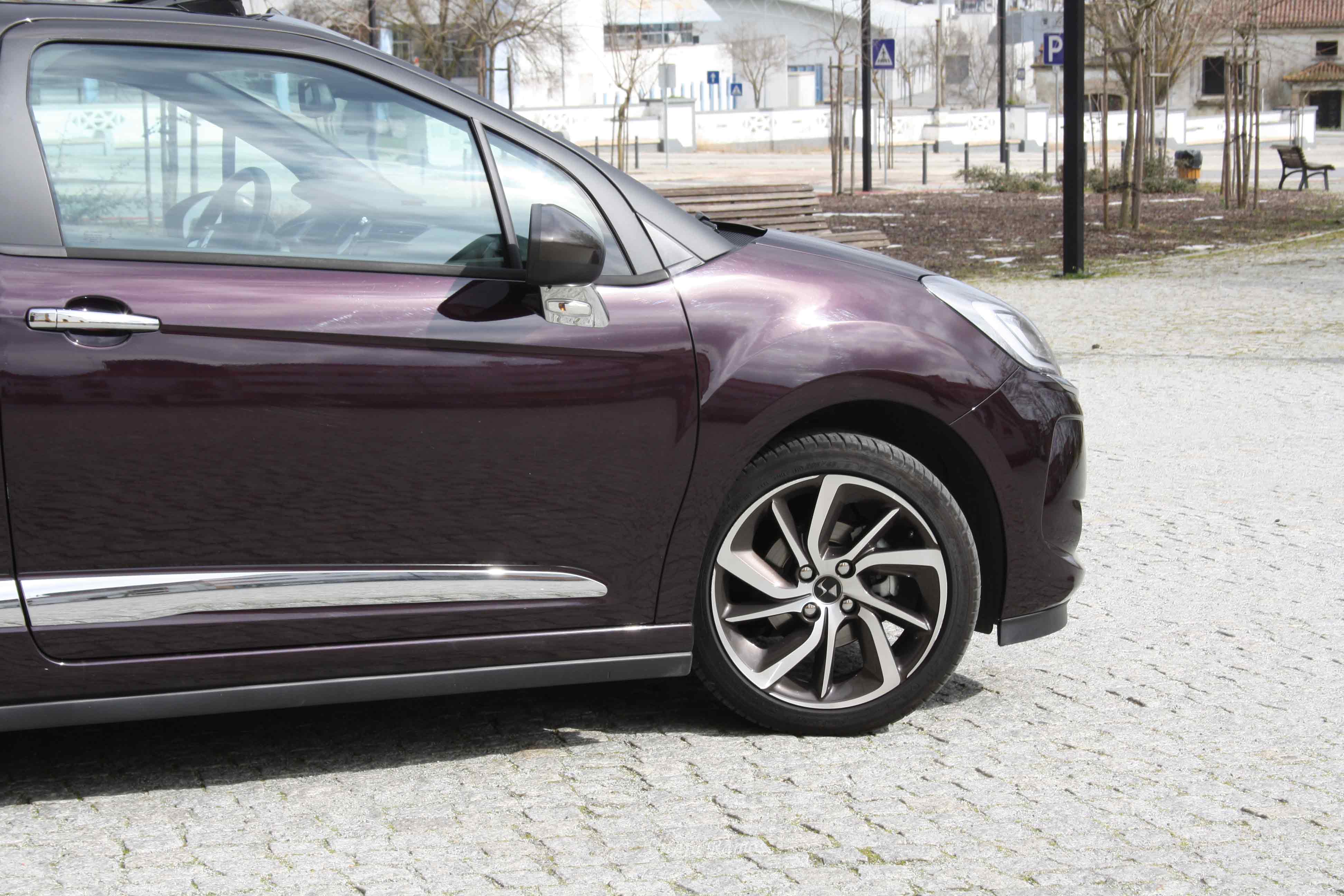 Nas laterais encontramos uma carroçaria robusta que tira dimensão aos vidros, que são escurecidos na traseira. O DS3 adopta puxadores cromados a contrastar com as jantes de 17 polegadas com 2 tons. Ainda nas laterais contamos com um friso cromado junto à embaladeira que acentua o design “premium” da DS.
