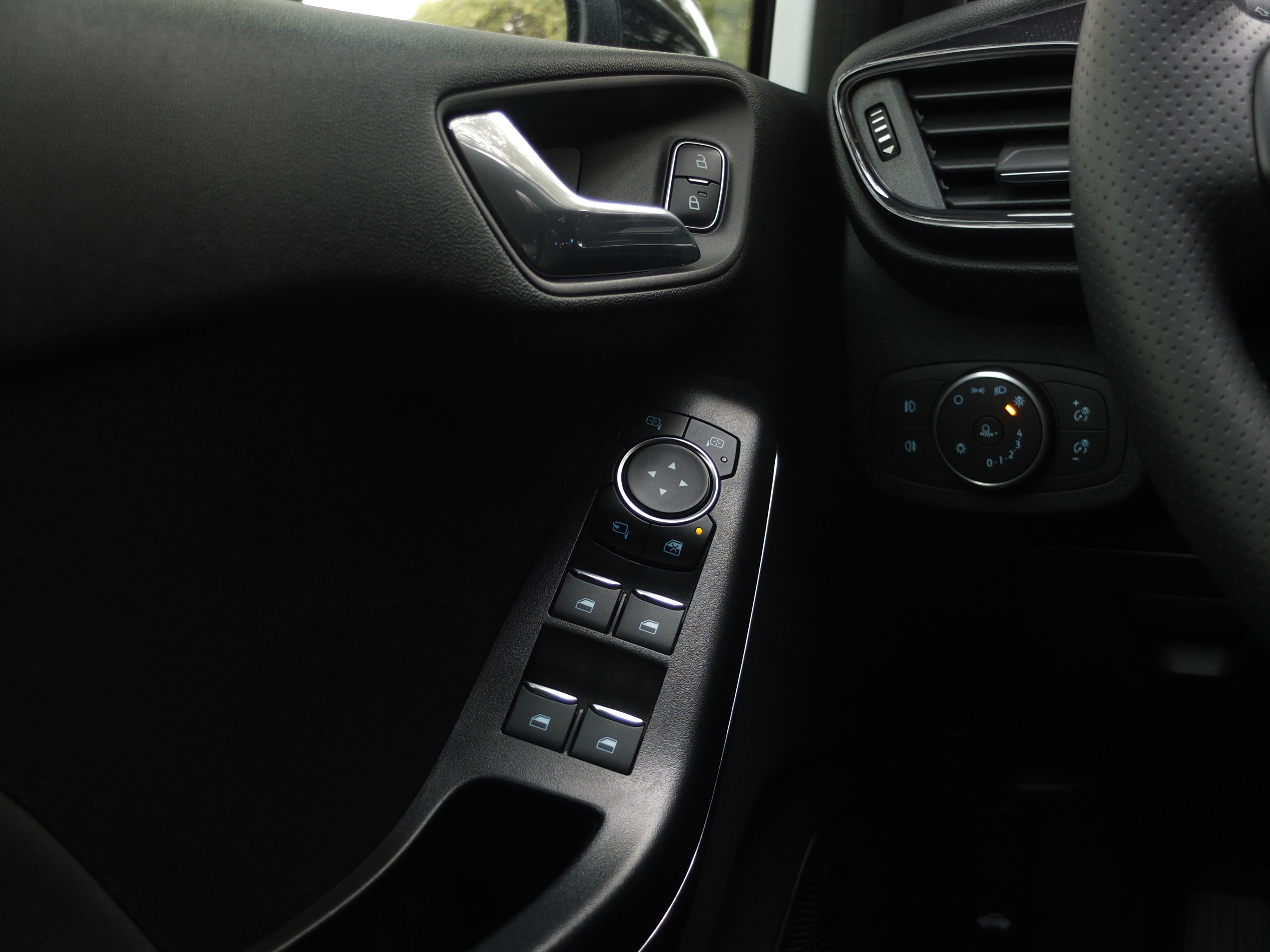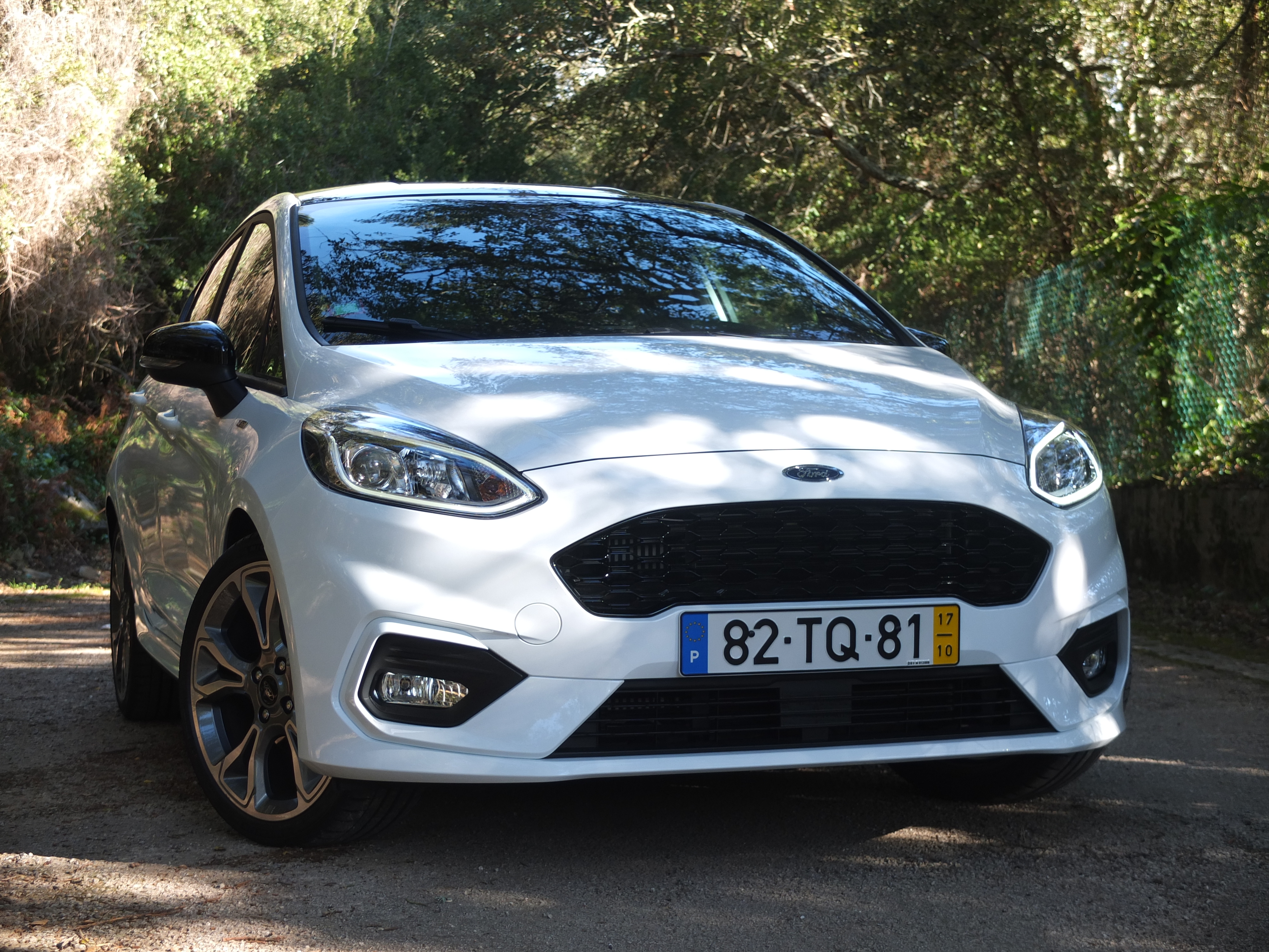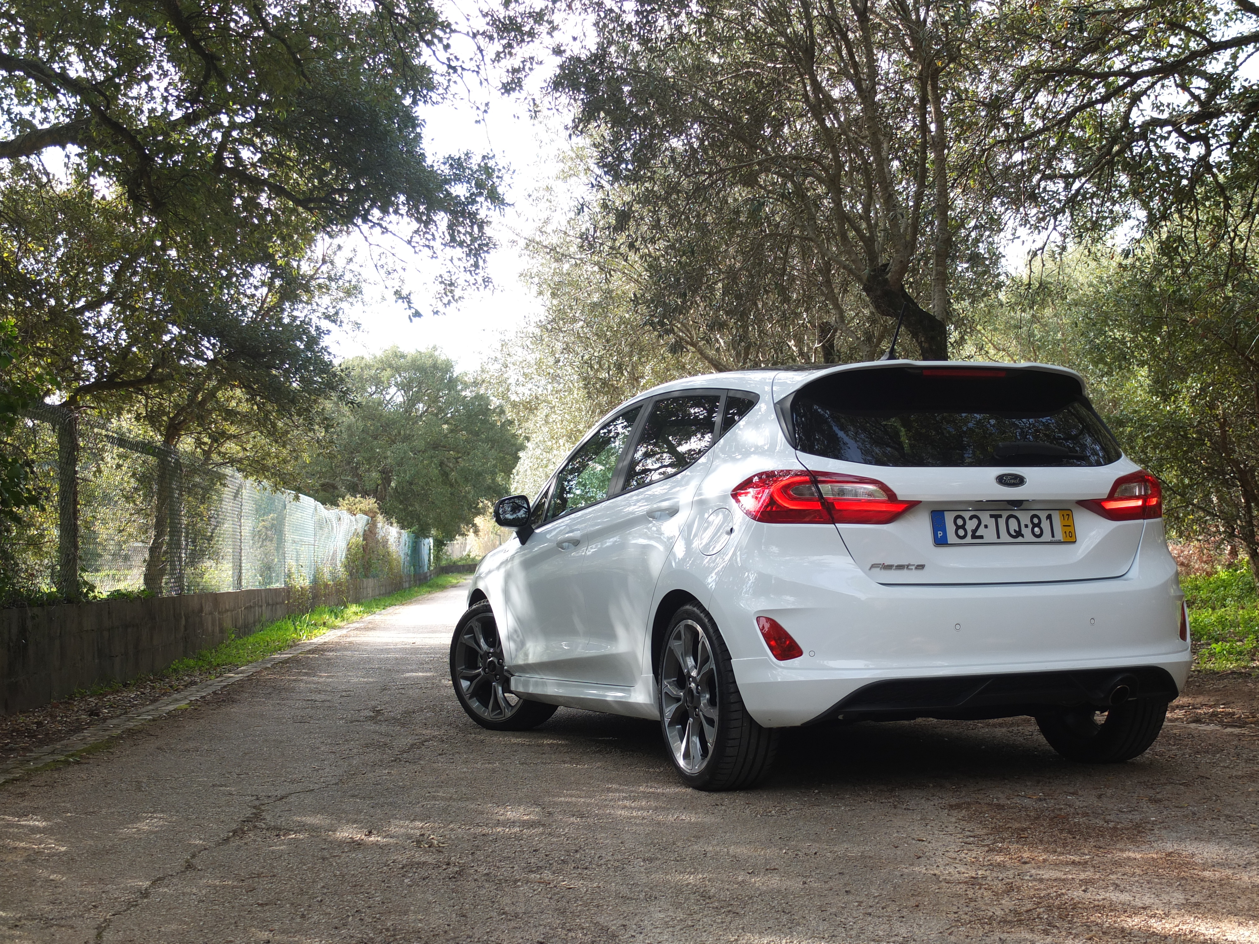 Nesta versão ST Line o equipamento exterior convence, pois temos pintura bi-tom, jantes de 18 polegadas envolvidas em pneus 205/40R18 Michelin Pilot Sport 4, vidros traseiros escurecidos e luzes LED na dianteira e traseira. Quando as portas se abrem, há sempre uma borracha protectora que surge para proteger a porta do Fiesta e a porta de outros automóveis. A lista de opcionais é vasta e para todos os gostos.