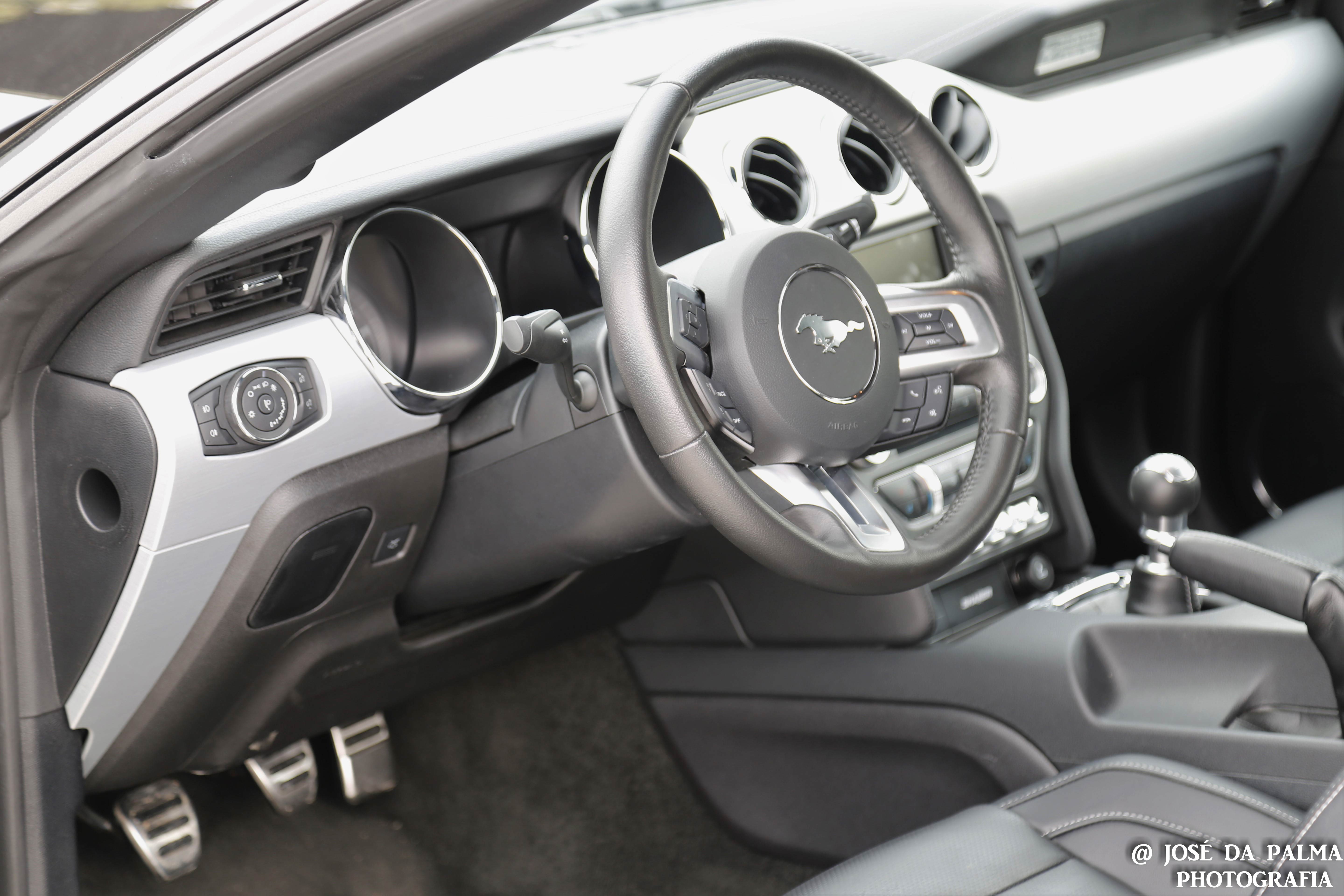 Os comandos estão colocados na posição certa, contamos com um estilo “retro” e pormenores sem igual. O tablier em alumínio com saídas de ar redondas, o volante com o logo “Mustang”, os comandos do ar-condicionado e do rádio também eles com um estilo que nos leva para o passado. A chapa a dizer: “Mustang Since 1964”, o conta rotações a dizer “Revolutions Per Minute” e o velocímetro a dizer “Groundspeed”… Estes são alguns dos elementos herdados pelo modelo clássico americano.