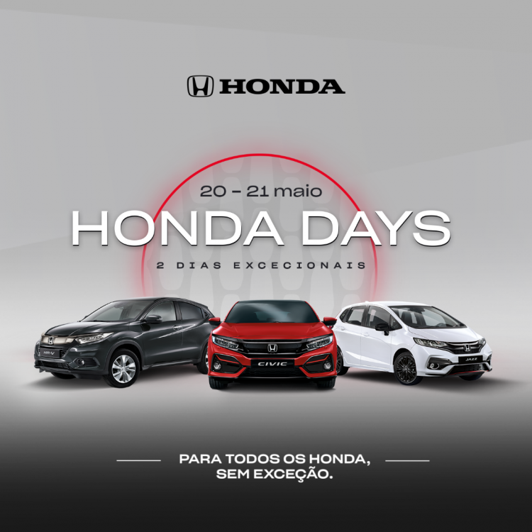 Os Honda Days regressam, nos dias 20 e 21 de maio, em toda a rede Honda, num evento dedicado a todos os Honda, sem exceção. Estes dois dias de ofertas únicas de vendas e após–venda, fortalecem a imagem da Honda como uma marca confiável e sempre atenta às necessidades dos seus clientes.