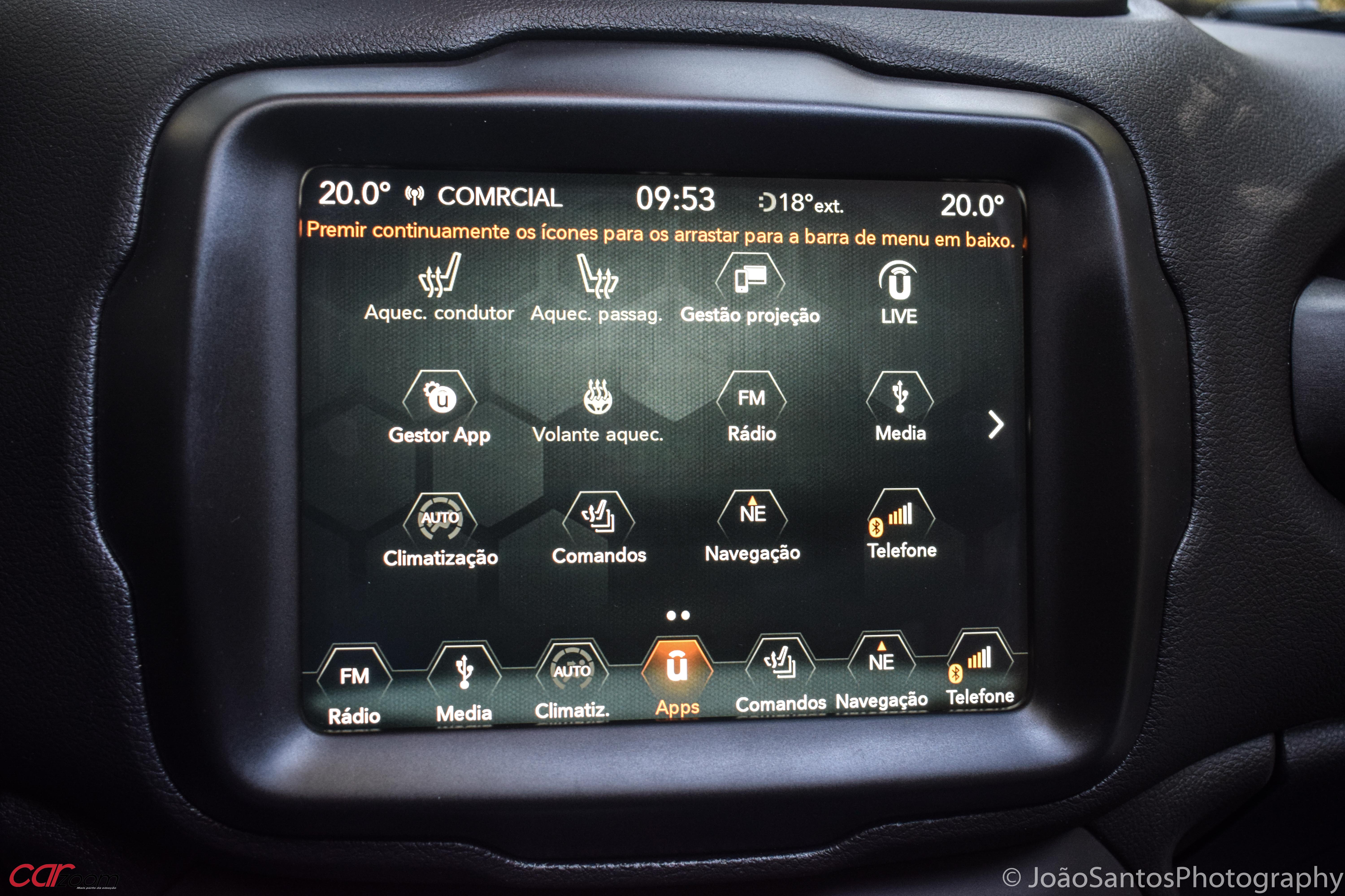 O sistema de navegação é intuitivo, tem boa imagem e é rápido q.b. Tem uma navegação eficiente, uma loja online que nos permite descarregar várias aplicações e como é quase “obrigatório” neste tipo de sistemas está preparado para o Android Auto e Apple CarPlay. Seria também de esperar que um automóvel de uma marca tão focada no todo-o-terreno tivesse também no sistema de navegação e multimédia, uma aplicação relacionada com o “fora de estrada” e tem mesmo. O “Jeep Skills” mostra-nos a aceleração e inclinação do veiculo, assim como a carga da bateria e outras utilidades, apesar desta ser a versão de tracção dianteira. Na versão Trailhawk conseguimos ainda mais informações desta aplicação.