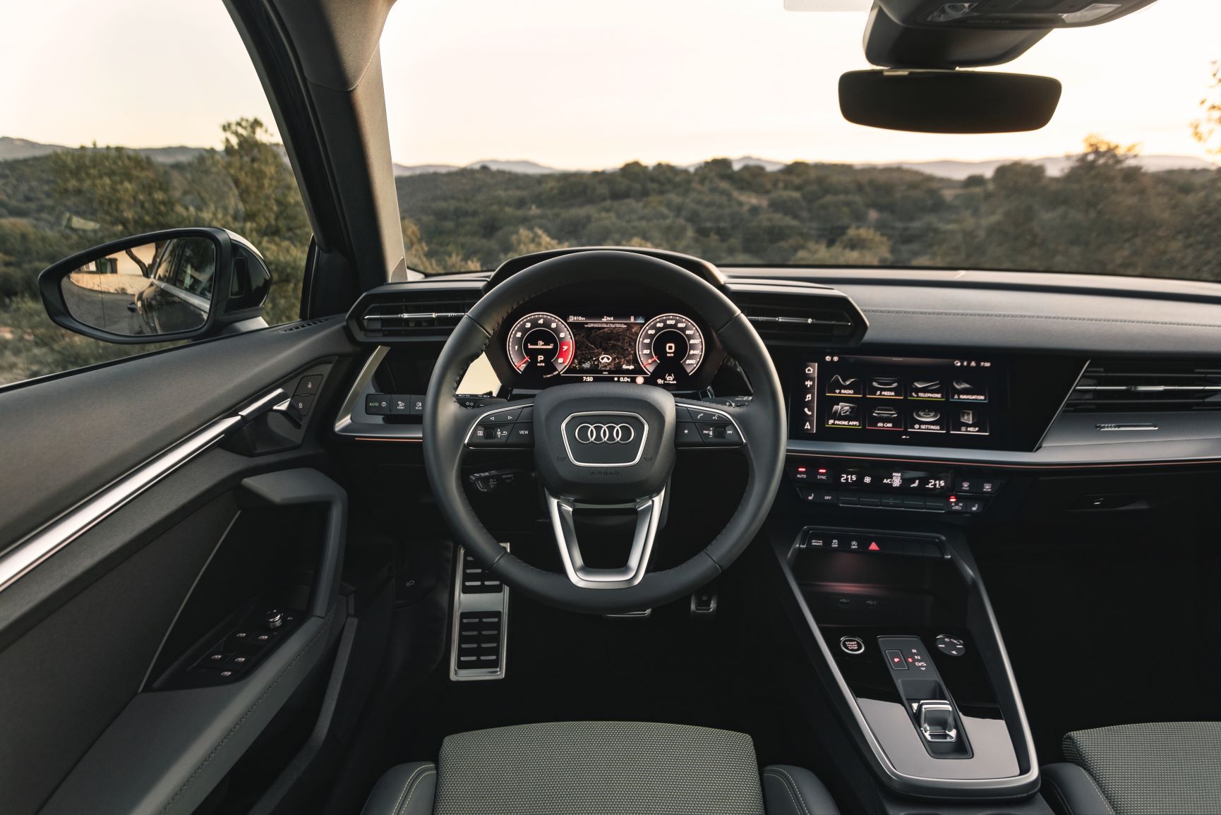 O interior pode ser enriquecido com o pacote de iluminação plus multicor, através do qual os utilizadores podem, em qualquer instante, selecionar 30 cores diferentes para a iluminação ambiente, criando um perfil de cores de acordo com a sua preferência. O ecrã MMI tátil tem 10,1 polegadas e encontra-se embutido numa superfície preta de alto brilho. O habitáculo, que conta com o painel de instrumentos orientado para o condutor, a consola central com novo design e a patilha de seleção de velocidades (nas motorizações com caixa automática S tronic), tem vincado estilo desportivo e pode ser completado, em opção, com bancos desportivos dianteiros. O comando tátil para controlo do volume reconhece movimentos circulares e é uma novidade na gama do novo Audi A3.