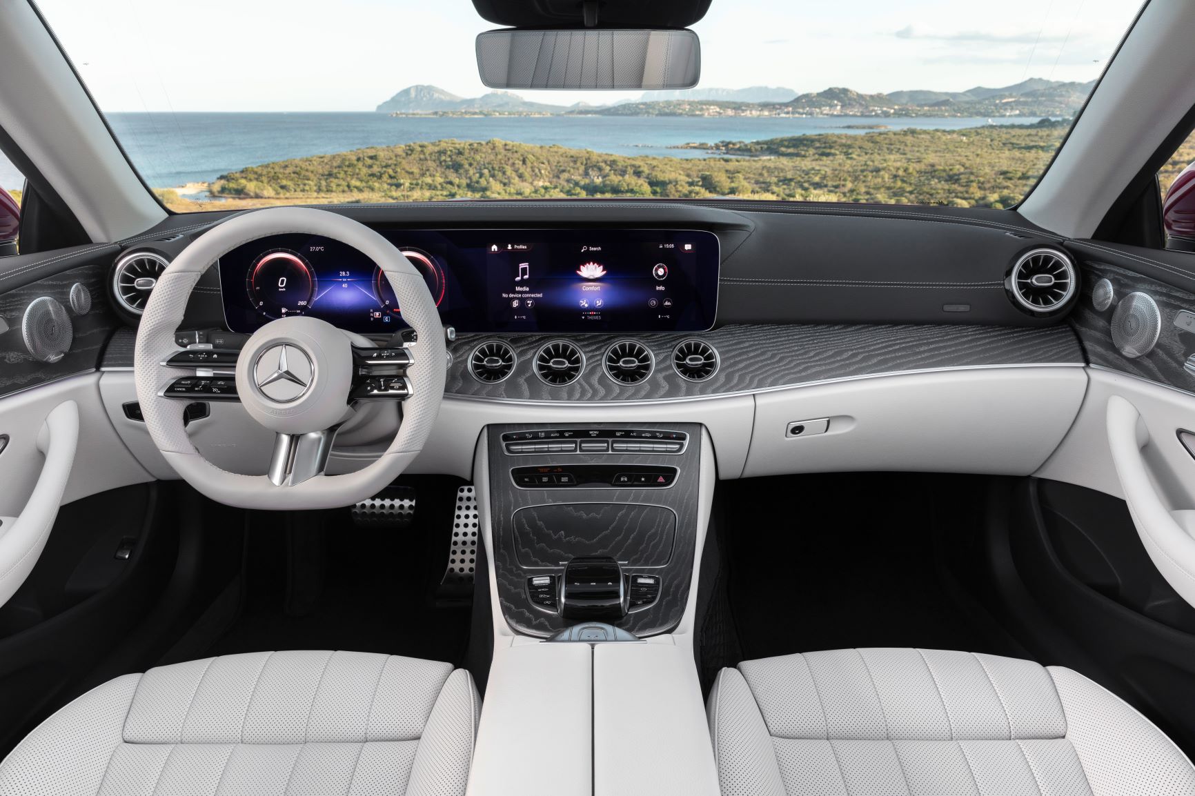 O Classe E Cabriolet com a clássica capota de lona oferece espaço e conforto aos quatro ocupantes durante as longas viagens. E fá-lo todo o ano: como opção, o Cabriolet pode ser equipado com o sistema elétrico defletor de ar AIRCAP e com o sistema de aquecimento da zona do pescoço AIRSCARF. A adequação para uma utilização sem restrições durante todo o ano é igualmente assegurada pela capota de lona acústica, um equipamento de série que ajuda a reduzir o nível de ruído sentido no interior do habitáculo. A sua estrutura multicamada com isolamento sofisticado também assegura um ambiente confortável, independentemente da estação do ano, e reduz o normal ruído do vento. Com as expressivas proporções típicas de um modelo coupé, com um design sensual e um conforto excecional para os quatro passageiros, o novo Classe E Coupé combina a beleza e o estilo clássico de um limousine desportivo de luxo com a tecnologia moderna.