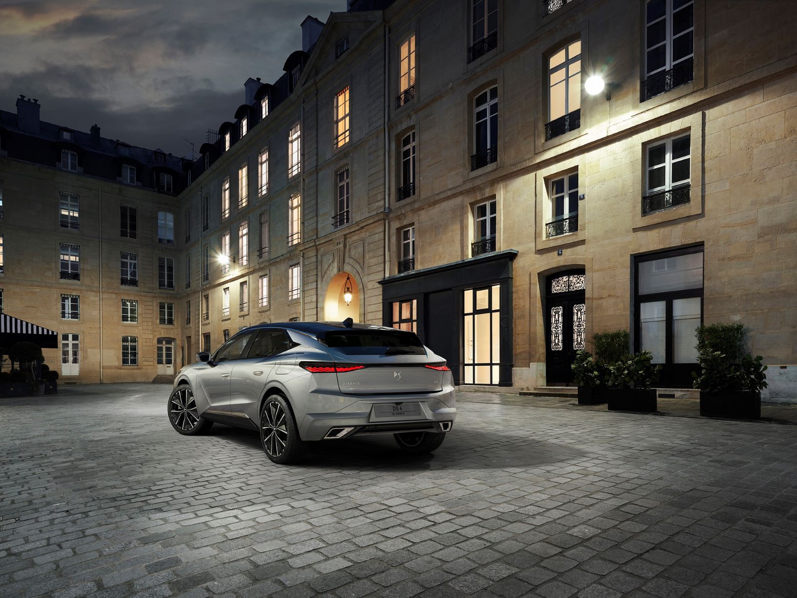 Na traseira, o tejadilho alonga-se acentuadamente para baixo até ao óculo traseiro particularmente inclinado, com película de esmalte que sublinha um exterior de reconhecida elegância. A silhueta ganha tanto em estilo como em eficiência aerodinâmica. Os guarda-lamas traseiros revelam volume generoso, com curvas e arestas vivas na carroçaria que destacam o pilar C, este marcado por um apontamento em preto brilhante, com o emblema DS Automobiles incrustado. A secção traseira apresenta uma assinatura luminosa de nova geração, com um efeito escamado progressivo, gravado a laser.