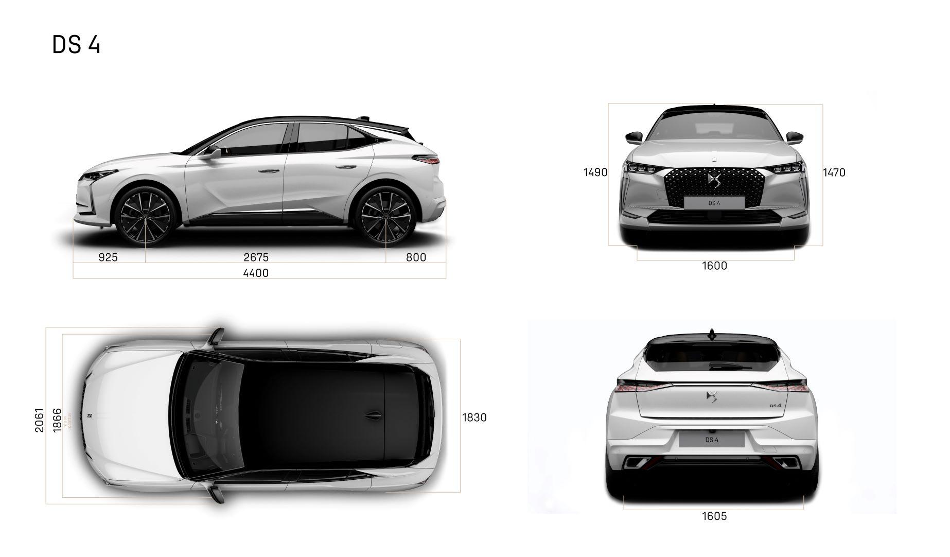 O DS 4 apresenta-se com proporções excecionais. Com uma largura de referência de 1,83 metros e rodas de grandes dimensões de 720 milímetros (jantes até 20 polegadas), para um comprimento compacto de 4,40 metros e uma altura de 1,47 metros, as dimensões são imponentes e conferem uma presença marcante.