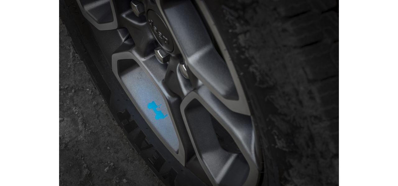 - Jantes de 18 polegadas com detalhes em azul e pneus para todo-o-terreno