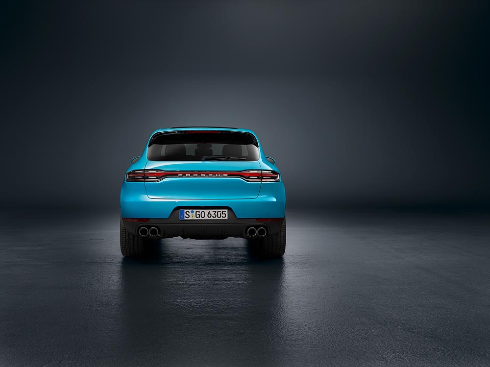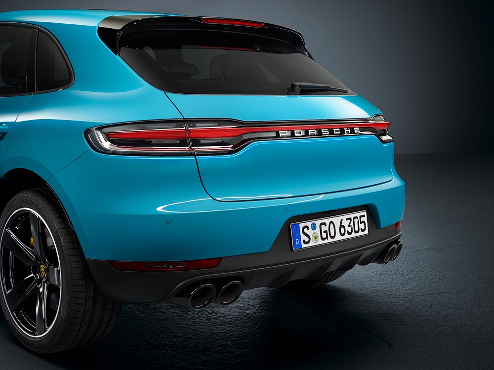 No exterior temos vários detalhes que nos levam ao Porsche 911 e 918 como a iluminação. O novo Macan está equipado com faróis de tecnologia LED e este sistema pode ser optimizado se o cliente assim o pretender. O Porsche Dynamic Light System Plus pode ser utilizado para controlar a distribuição de luz de forma adaptativa. A dianteira do Macan foi trabalhada trabalhada ao pormenor e parece agora mais larga, mantendo o design esguio. A faixa de luz tripartida com iluminação tridimensional em LED representa outro elemento de design já habitual na Porsche. O design de quatro pontos nas luzes de travagem reflete também a assinatura luminosa inconfundivel.