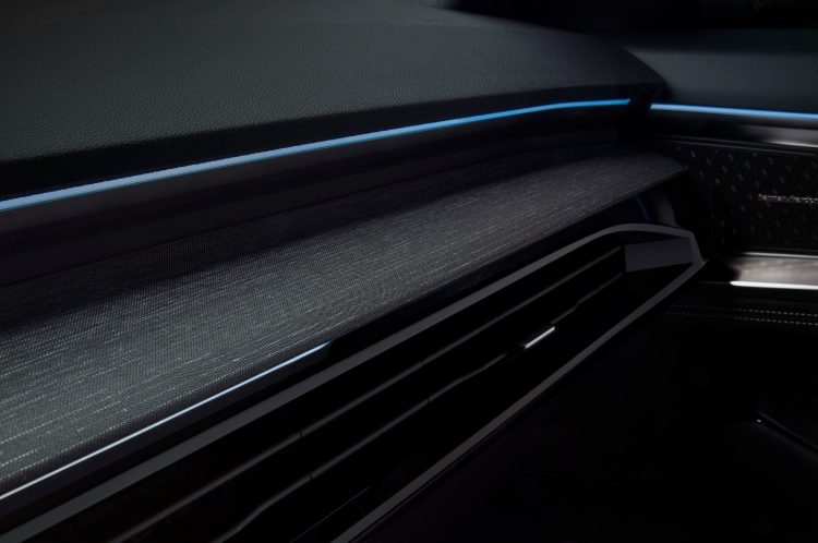 Na secção superior, a cobertura do tabliê foi removida, sendo este revestido com um acabamento mate e acolchoado, muito macio ao toque. A faixa de luz estende-se até aos painéis da porta, aumentando assim o apelo visual geral. Materiais de fina qualidade, tais como madeira real tratada de acordo com a técnica japonesa maki-e, elevam o design interior. Esta técnica de marcenaria realça o grão natural, utilizando um pano para aplicar várias camadas de pigmentos metálicos na madeira. A técnica preserva o grão natural e a textura da madeira. Por último, um elegante acabamento cromado acetinado envolve delicadamente a grelha horizontal de ventilação.