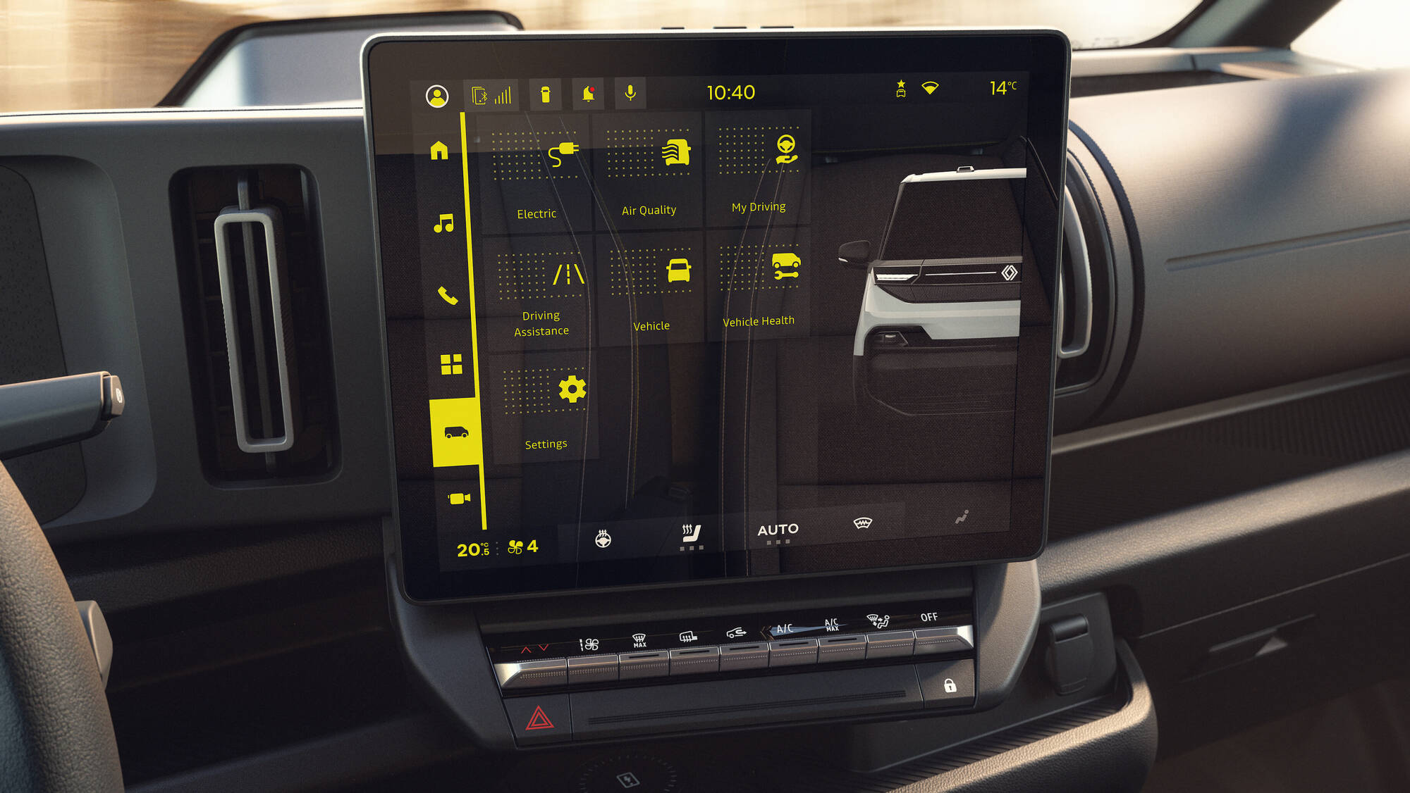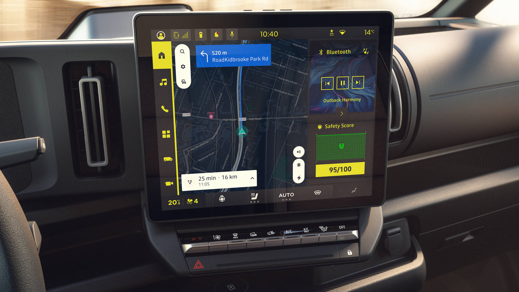 Com o apoio da tecnologia SDV, o Trafic também apresenta um sistema multimédia OpenR, de nova geração, com um ecrã de 12 polegadas, otimizado para veículos comerciais ligeiros. Com o maior ecrã da gama de veículos comerciais ligeiros da Renault, este sistema inclui uma função de navegação especialmente concebida para veículos comerciais, tendo em conta o seu tamanho e carga para evitar estradas inadequadas. Como resultado, o planeador de rotas a bordo apresenta as melhores rotas, sugerindo paragens de carregamento otimizadas, com base em dados de consumo mais precisos.