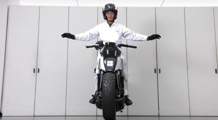 O protótipo da Honda move-se sozinho a velocidades até 5km/h, enquanto puxamos a moto da garagem ou quando arrancamos. A forquilha dianteira baixa ligeiramente para uma maior estabilidade e ao mesmo tempo a direcção ajusta-se à esquerda e à direita de forma a que moto mantenha o equilíbrio tanto com piloto como sem piloto.