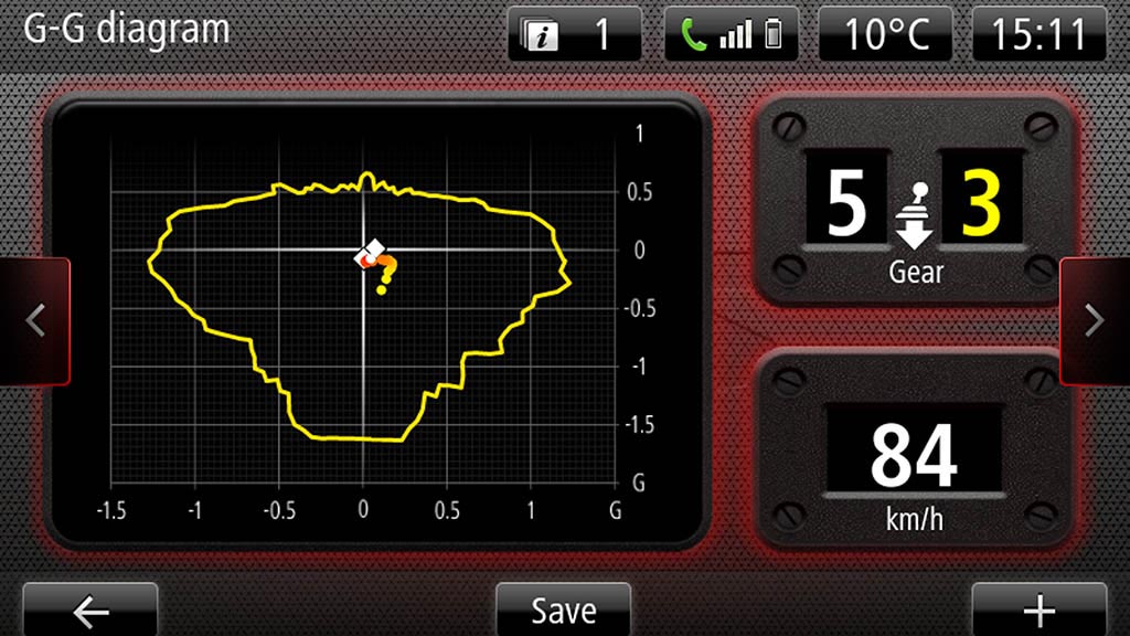 – Diagrama GG: leitura das acelerações longitudinais e laterais, bem como visualização dos valores máximos registados. Os sensores do ecrã podem ser gravados numa pen.