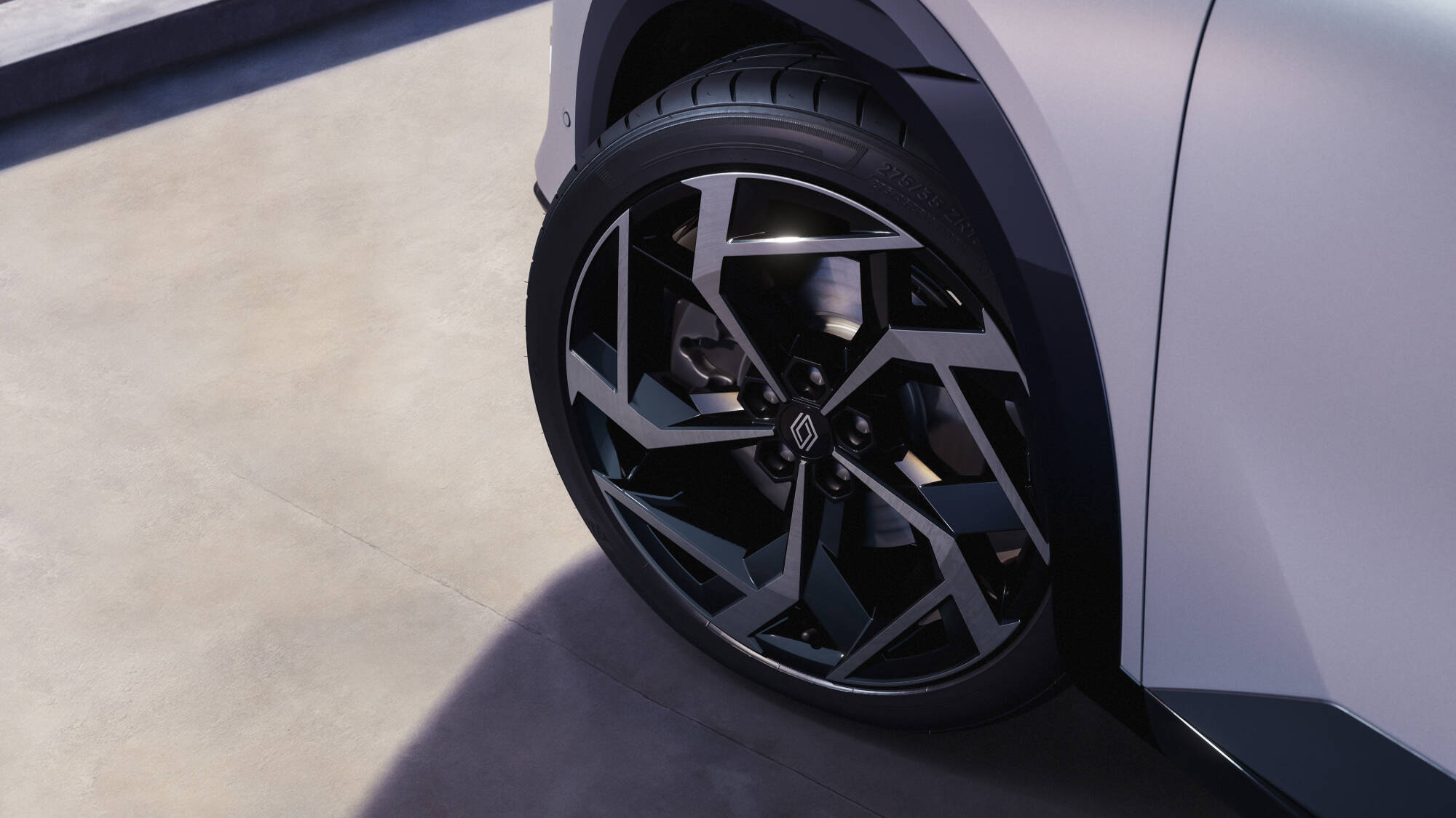 Os faróis LED foram concebidos como objetos independentes, formando um encaixe perfeito com a carroçaria. O seu design tridimensional realça a aparência premium e de alta tecnologia do automóvel. A assinatura das luzes diurnas (DRL) define um ângulo de 28°, uma referência subtil, mas direta, à geometria do logótipo da Renault. Uma sequência de iluminação de boas-vindas e despedida acentua a experiência emocional e estabelece uma ligação simbólica entre o automóvel e o seu condutor. Por fim, o capot alto, ligeiramente abaulado e com nervuras, reforça a perceção de robustez.