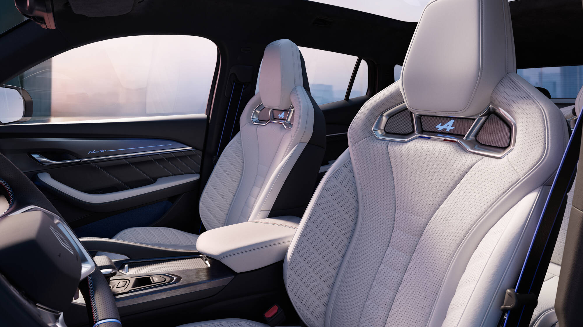 Os bancos dianteiros, com encostos de cabeça integrados, ilustram a experiência da Renault em termos de conforto e qualidade percebida. Os bancos são fortemente esculpidos e envolventes, para um conforto ainda maior. Os encostos de cabeça perfurados, a assinatura Alpine retroiluminada na versão Esprit Alpine e as costuras contrastantes sublinham o ênfase dado ao design exclusivo, enquanto a mistura de padrões geométricos e perfurações otimiza tanto o apoio como a ventilação.