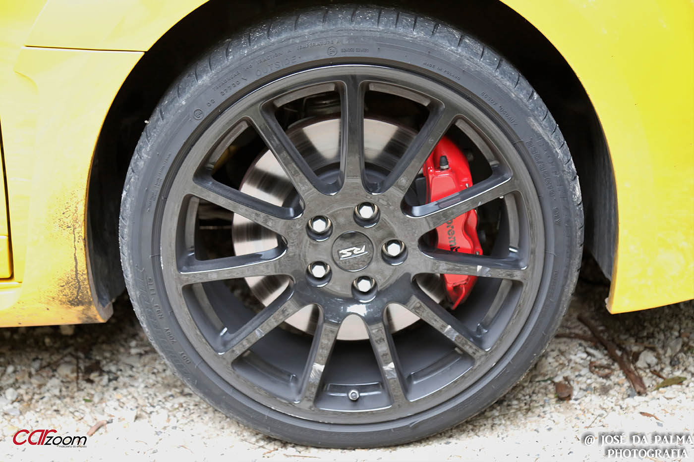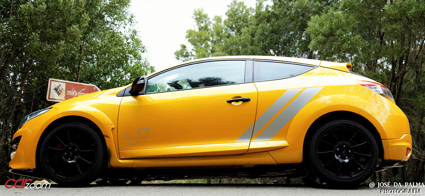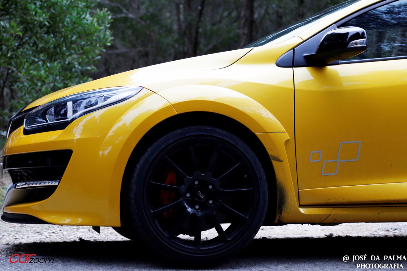 Quando levantei o Mégane, fiquei sem palavras, só de olhar para aquele “amarelão”. As jantes de 19 polegadas speedline pintadas a preto, os pneus 235/35, as entradas de ar, a decoração Trophy.