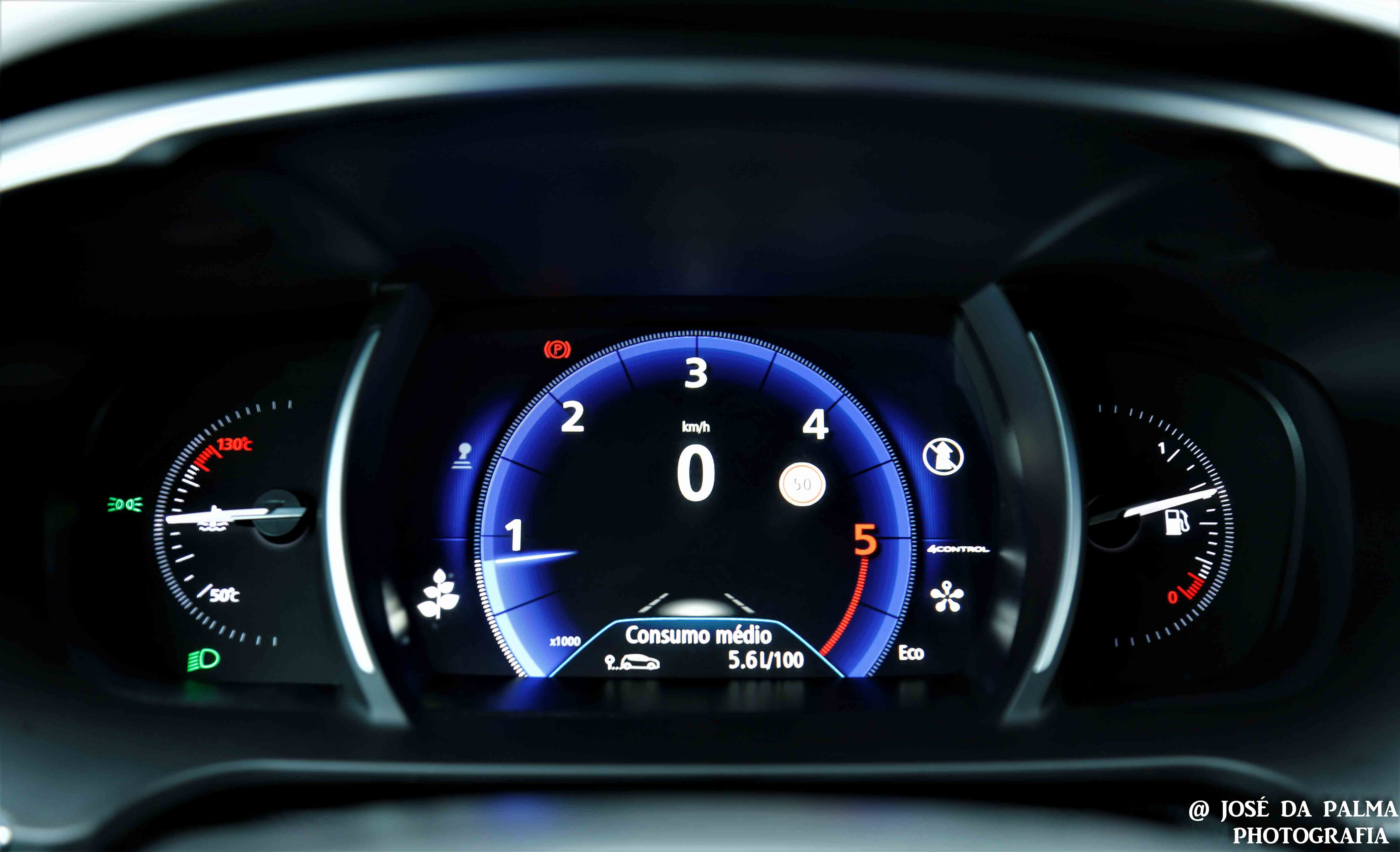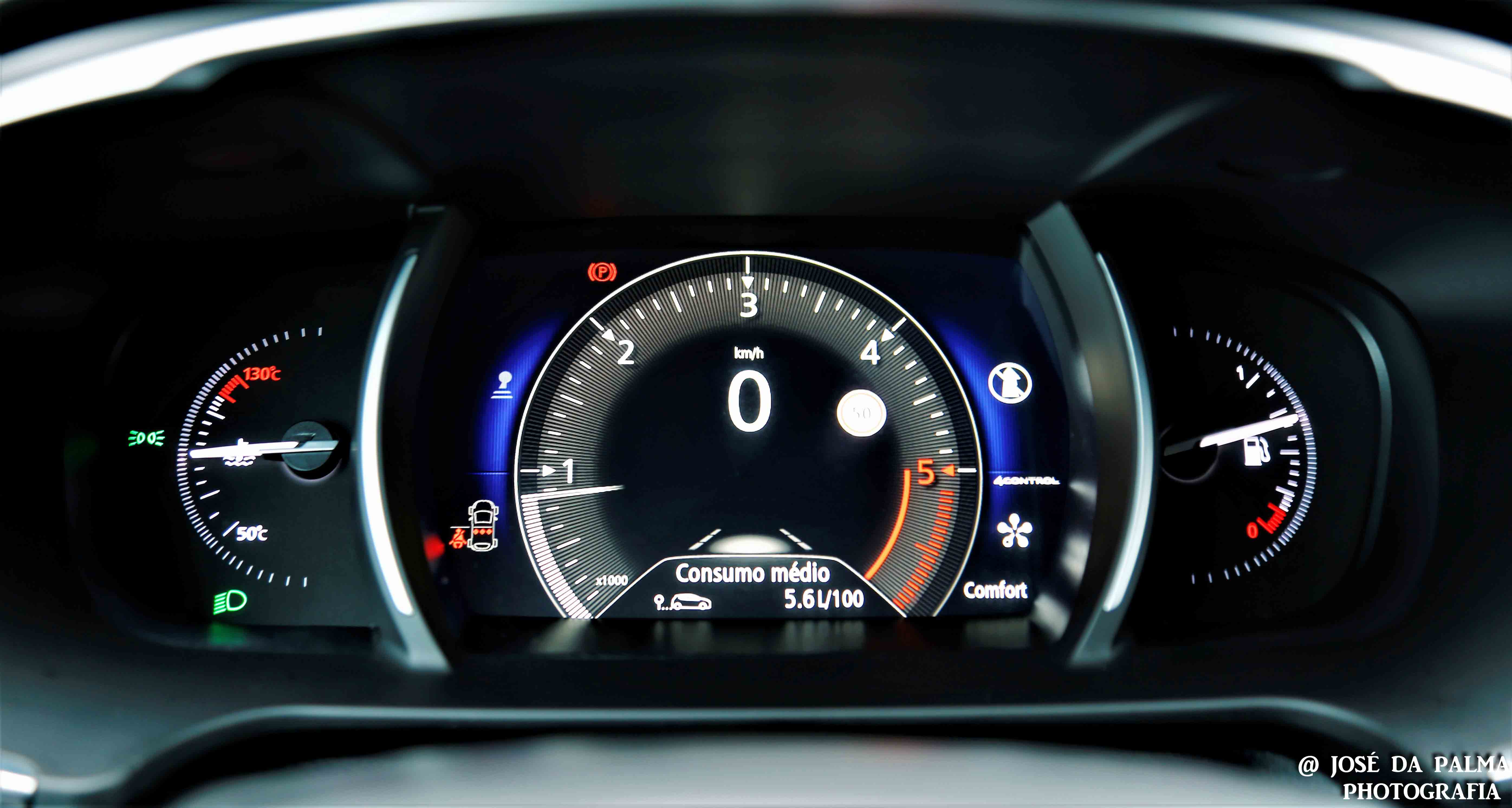 O painel de instrumentos altera-se consoante o modo de condução e é bastante completo, fornece-nos para além dos normais dados de viagem e consumos, uma folha que se enche de cor consoante a aceleração, que nos ajuda a poupar combustivel, temos barras de potência e binário, bússola, informações dos sistemas de ajuda à condução, informações de navegação, entre outros.