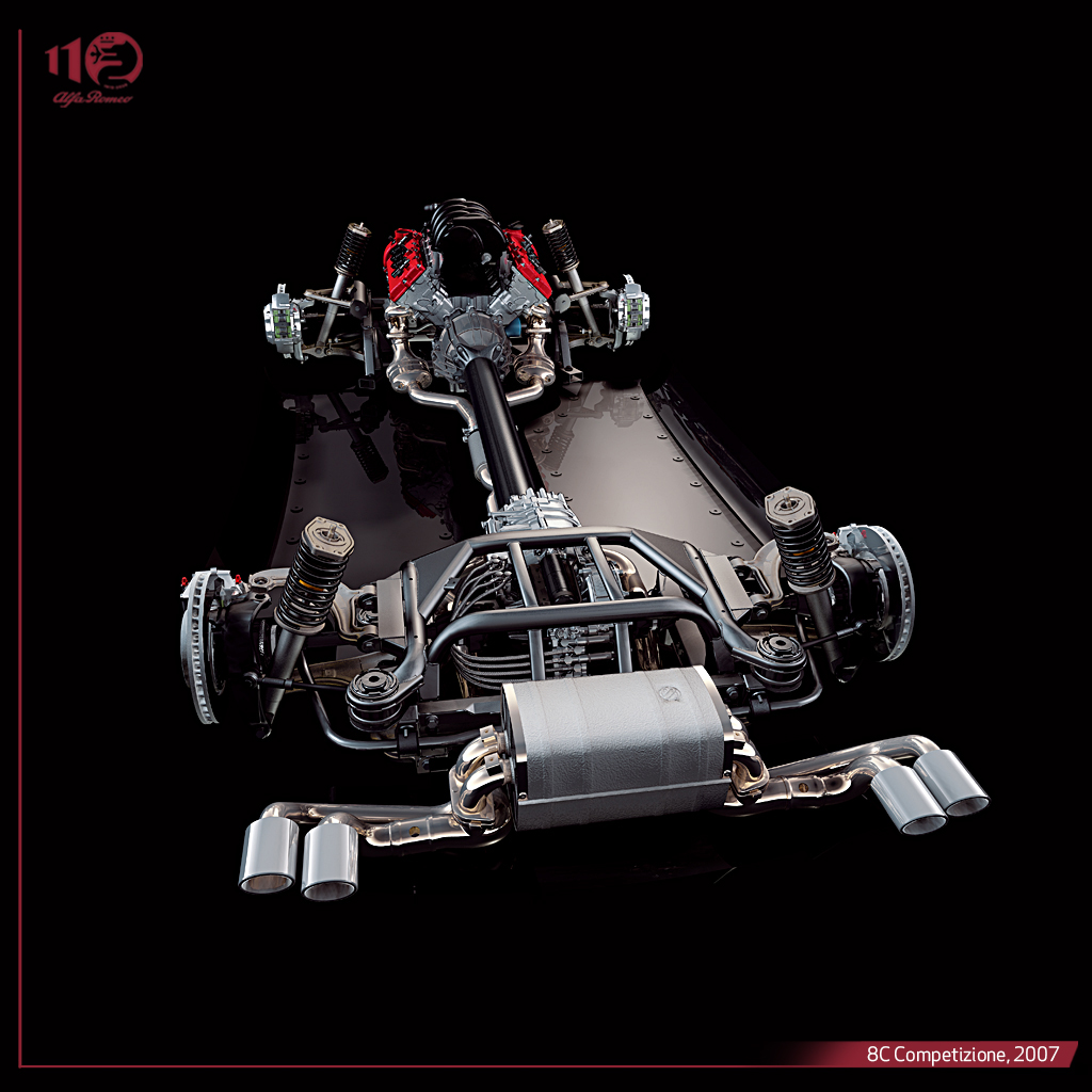 Nascido para sintetizar e relançar a essência da Alfa Romeo, o 8C recupera temas técnicos desde sempre caros à Marca. Como a leveza, obtida com a adoção de um chassi dual frame e com a utilização de alumínio, titânio, carbono e materiais compósitos. Como o equilíbrio entre o peso à frente e o peso atrás, conseguido com o esquema “transaxle” (motor em posição dianteira longitudinal e caixa de velocidades no eixo traseiro). Como a precisão de condução, otimizada com a adoção de suspensões de braços duplos transversais em ambos os eixos.