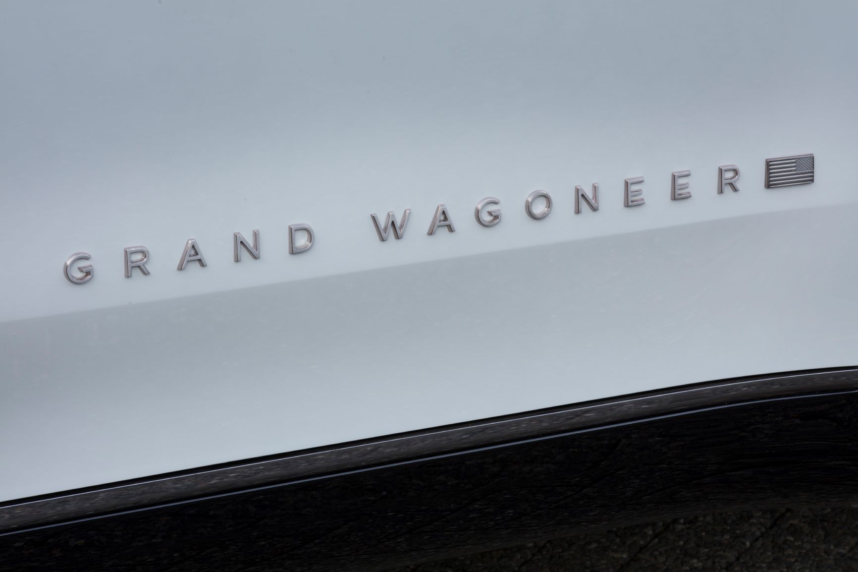 Letras em alumínio sobre-elevadas com detalhes laterais em cobre formam as palavras “Grand Wagoneer” no terço inferior de cada porta da frente. A bandeira americana ladeia as letras em alumínio e presta tributo ao país de origem da Marca.
